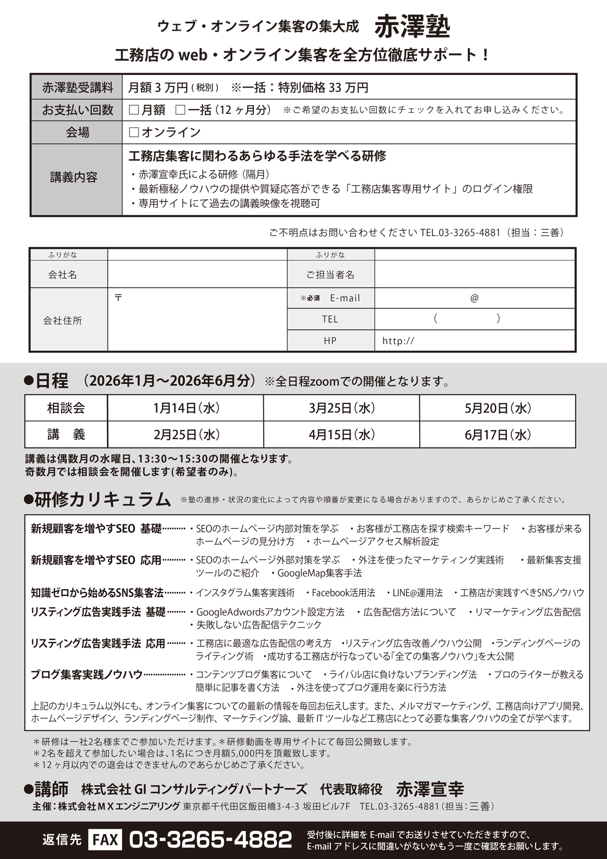 赤澤塾 ー工務店集客の最高峰プロジェクトー 赤澤塾参加申し込み 会社名必須 お名前必須 役職 メールアドレス必須 お支払い回数必須 月払い 33,000円(税込)/月 *原則12ヵ月契約一括払い 363,000円(税込) *月払いより1ヶ月分無料 お支払い方法必須 口座振替銀行振込 コメント *お申込み後、担当者よりセミナー参加方法および参加費のお支払いについてのご連絡をメールにてご返信させて頂きます。 Δ Posted by mx-eng