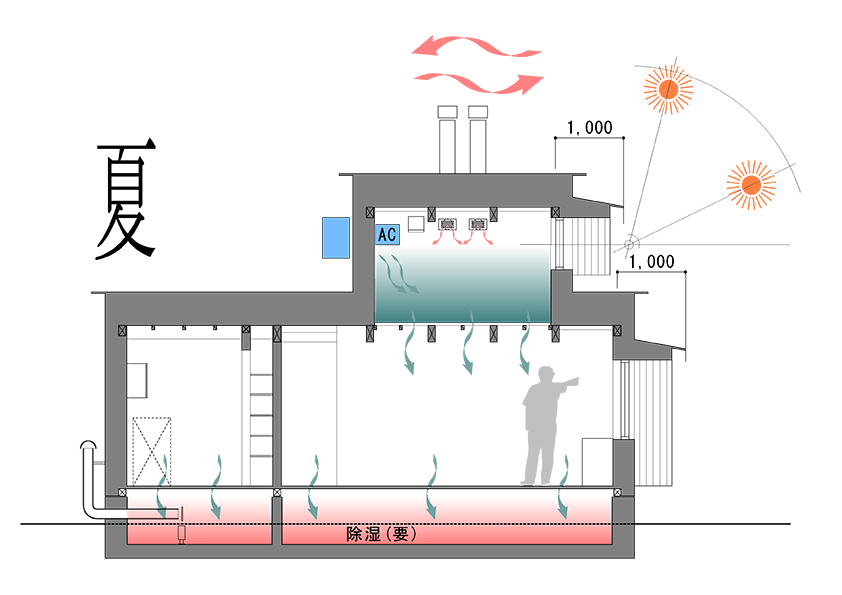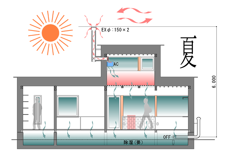 内外温度差、室内の温度差などを利用して、換気を行うことをパッシブ換気といいます。それは、動力を使わずに換気を行うということで、エネルギーの消費を抑えて換気を行うシステムになっています。自然派の工務店の皆さんは取り組まれている仕組みになります。