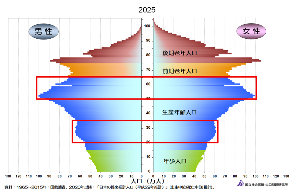 2025年の人口構成のグラフを国立社会保障・人口問題研究所のデータからもらいました。