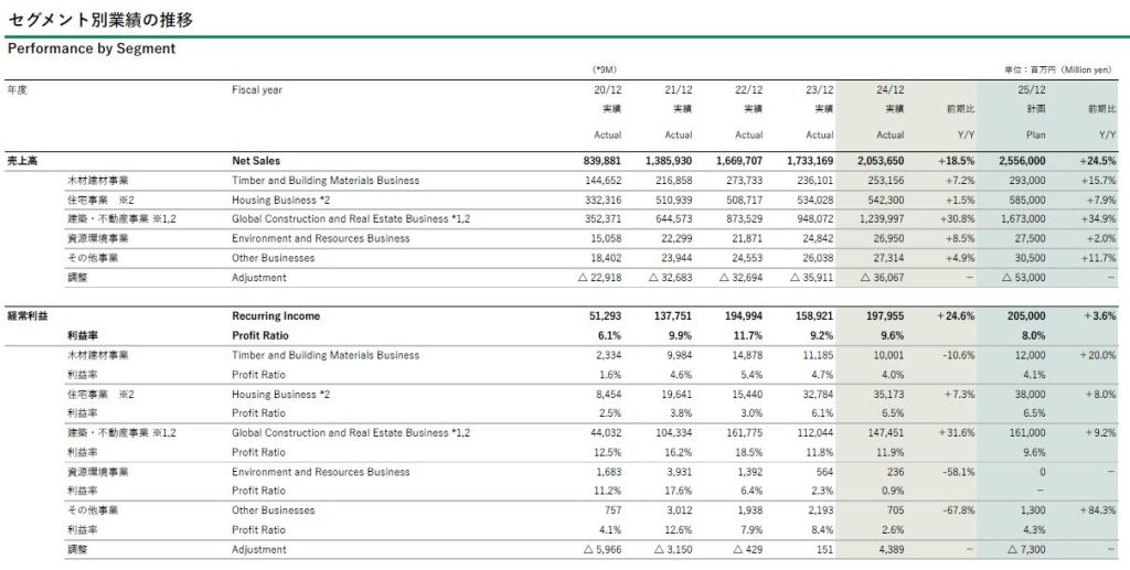 円安の恩恵も受けているのだと思いますが、すごい勢いで伸びています。特に海外部門の伸びがすごく、住友林業はアメリカのビルダーと言っても過言ではありません。