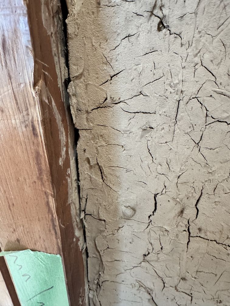 タイベックのような透湿防水シートなどのフィルムが一切無いので、この柱と土が繋がっていれば問題ないのですが、見ると解ると思いますが、土が縮んでいます。
