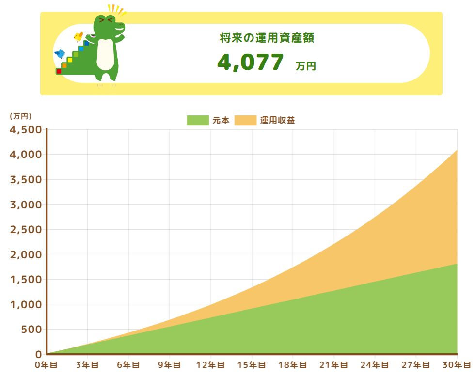 というのも、月に5万円を5%の利回りで運用すると、30年後には、4,077円になっています。金融庁のサイトで計算してみました。
