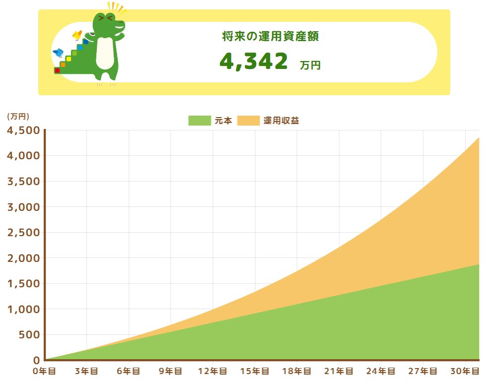これが、複利の威力で、31年後には、4,342万円とたった1年で、なんと300万円近く増えている計算になります。