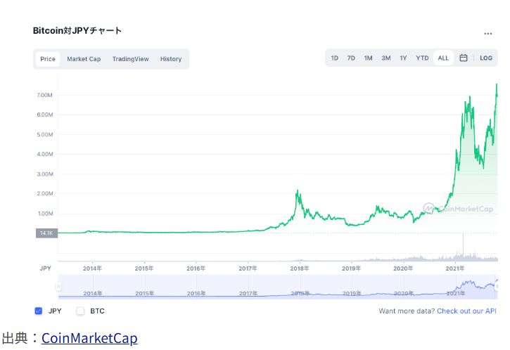 ビットコインの値動きが荒くて、14.1K が4,5年で7百万を超えました。この差が50倍ぐらいになっています。現在は更に値段を上げているので、2016年とか2017年に100万円投資した方は、1億円になっていても不思議ではありません。