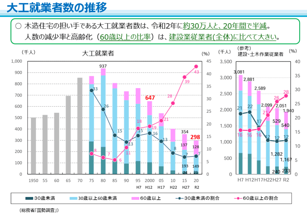 1980年代に900万人いた大工が、今は300万人切っており、1/3になっています。