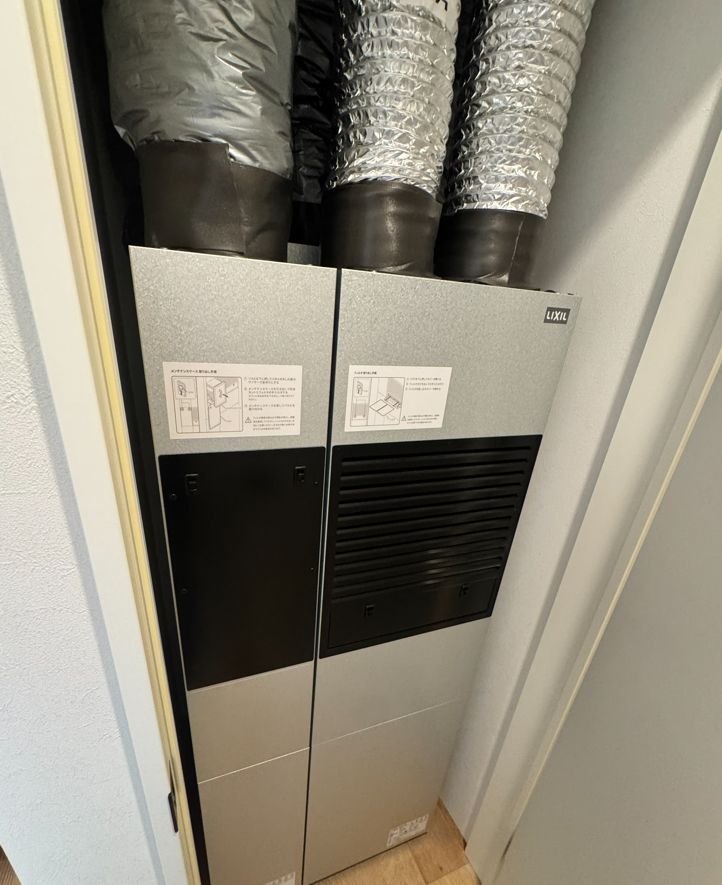 この建物がそうですが、空調と熱交換換気システムが一体になっているシステムを建物内において、そこからダクトが屋内に配る仕組みです。